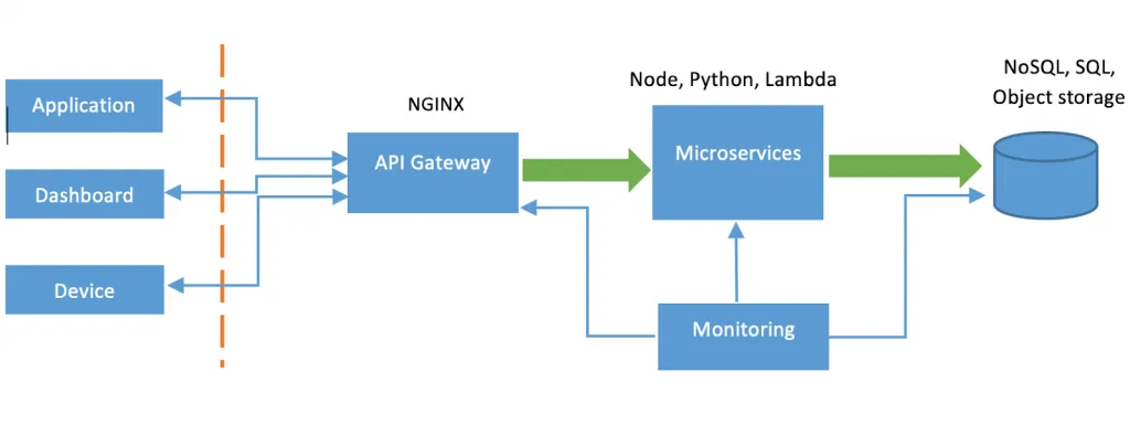Figure 1 shows the key elements of the Lightmetrics backend. Requests are received from various clients by a reverse proxy server. This additional server is also used to enable request caching and any additional filtering on the requests. After authentication, requests are handled by our microservices. These microservices interact with cloud-hosted databases and storage services.
