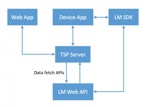 The recommended way of building applications using RideView is illustrated in Figure 2. A device application is built using the RideView device SDK. The SDK communicates with the Lightmetrics API services – the creation of a trip, fetching asset configurations are examples of services invoked by the SDK. Appropriate data is created in the database, which is made available through web API endpoints. LM web APIs are available for consumption, via the TSP server, on the user-facing web application. These APIs provide services to fetch trips, violations, aggregate stats., trip details, and more.