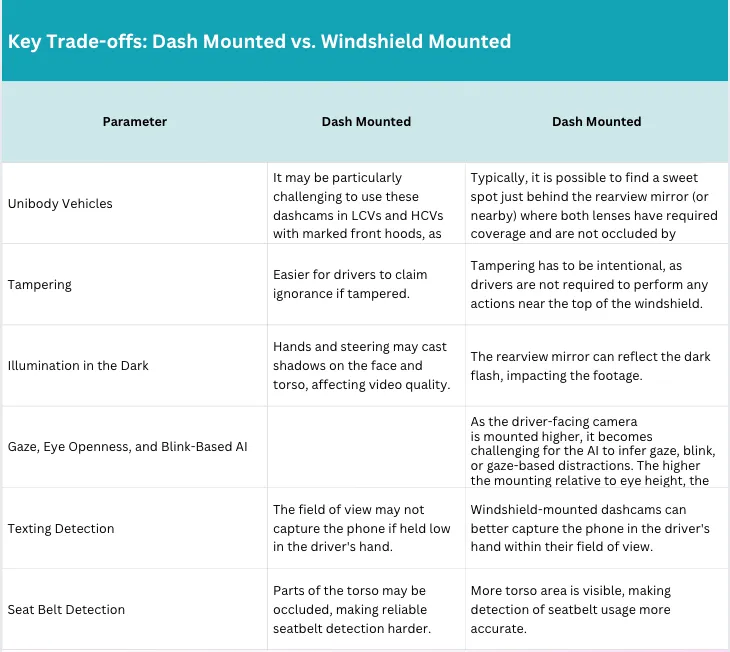 Elegir entre una dashcam montada en el salpicadero o en el parabrisas no es sólo una decisión de hardware, sino que afecta al campo de visión, a las entradas de los sensores y a la calidad de la supervisión del conductor. Aquí tienes una rápida comparación de las ventajas y desventajas a tener en cuenta para un rendimiento óptimo.