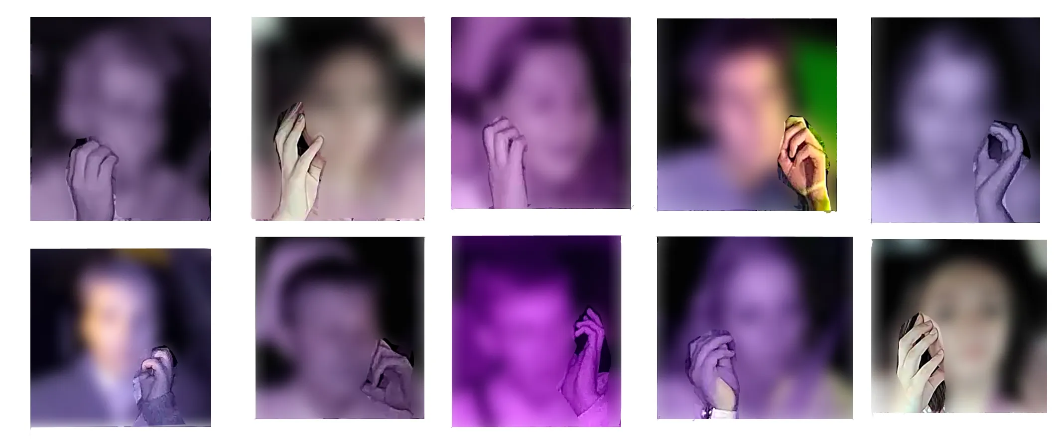 Como puede observarse, el objeto en la mano suele ser negro y a veces apenas es visible debido a que se mezcla con el fondo. Por defecto, el modelo de red neuronal empieza a centrarse en la posición de la mano y los dedos como característica dominante y, en muchos casos, empieza a emitir alertas de móvil incluso cuando no hay ningún objeto en la mano. Enseñar a la red neuronal a centrarse en el objeto de la mano fue uno de los principales objetivos a la hora de diseñar nuestros experimentos de entrenamiento.