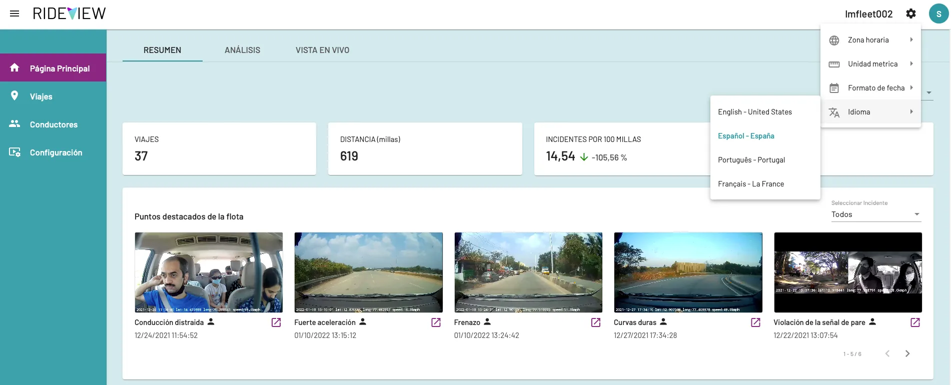 As we have mentioned before, our fully featured fleet portals are an important option for TSPs who need a fast integration and launch of the RideView platform – through rebranding and single sign-on and iFrame integrations. While that has been a matter of weeks for our customers in the english-speaking world, it left customers in other countries without native language support and reliant on browser-based translation engines. That changed recently with the addition of native language support for Portuguese, Spanish, and French. For TSPs in countries where these languages are prevalent, it is now a matter of weeks to launch an advanced video telematics solution.